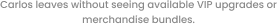 - Carlos buys tickets for a music festival but is not informed about VIP upgrades, merchandise combos, or food coupons resulting in lost upsell revenue.
