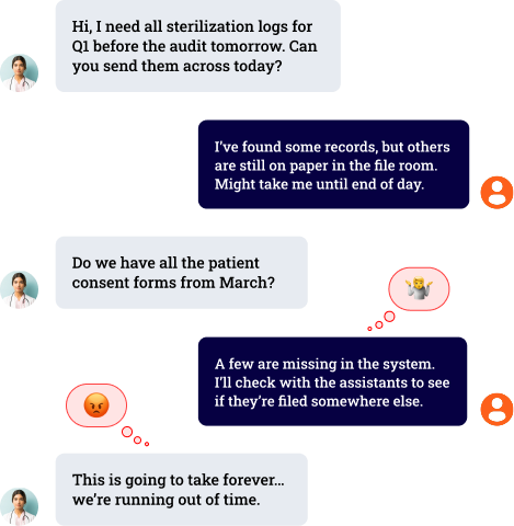 Lisa asks the chatbot: “Show me OSHA logs and signed consents from Q1.” The bot retrieves everything sorted by date and patient ID.