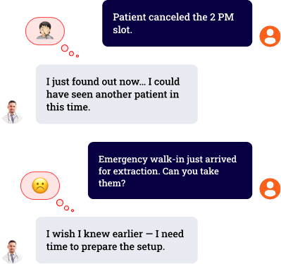 Last-minute cancellations or emergency walk-ins are relayed manually via sticky notes or delayed texts. Dental associates are often informed too late, leading to idle chair time or rushed preparations.