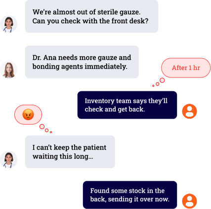 Ana, a dental associate, realizes mid-procedure that sterile gauze and bonding agents are nearly out. The front desk contacts inventory staff, who respond an hour later. Two patients are delayed due to the scramble.