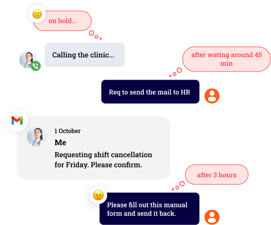 Dr. Laura, a dental associate, realizes she can’t make her Friday shift. She calls the clinic but is placed on hold. After a long wait, she’s advised to email HR. Three hours later, HR replies with a manual form. Meanwhile, the clinic manager remains unaware, leading to a scheduling conflict and disrupted patient bookings.