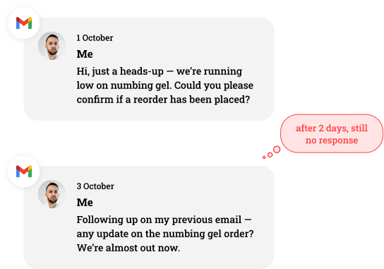 Marcus, a dental assistant, notices that numbing gel is running low. He sends an email to procurement and waits. Days pass with no update. Eventually, shortages cause procedure delays and damage the clinic’s reputation.