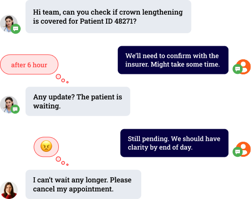 Dental associates often spend valuable time waiting for updates from front desk staff, lab technicians, or insurance coordinators-delays that disrupt clinical workflows and lead to idle chair time.