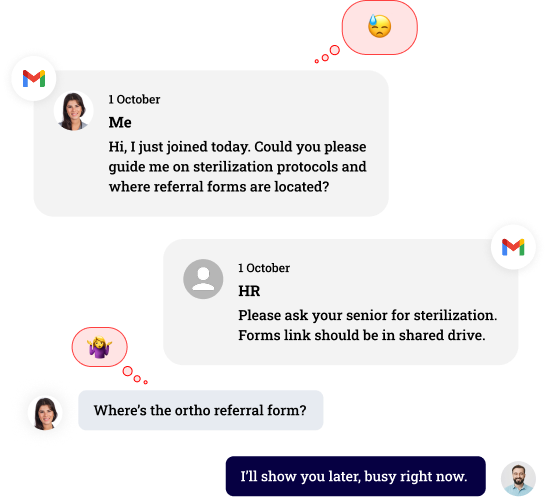 Nina, a new dental associate, is unsure about protocols like sterilization, referral procedures, and standard form locations. She emails HR and shadows a busy senior, but remains unproductive for weeks. Errors creep in due to the learning curve.